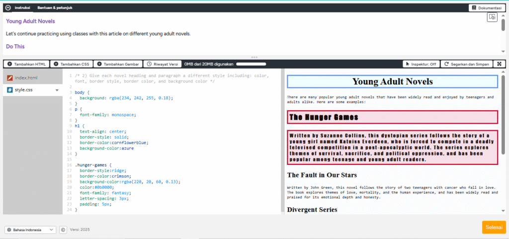 Di sini kalian disuruh Mendisain Sebuah foto air terjun yang paling atas. cara mendisain gambar ukuran air terjun, kalian bisa menggunakan CSS Classes.cara melihat contoh codenya ada di bantuan & petunjuk yang ada di atas di sebelah instruksi,Jika sudah lalu pilih opsi tulisan Classes lalu akan ada tampilan seperti ini