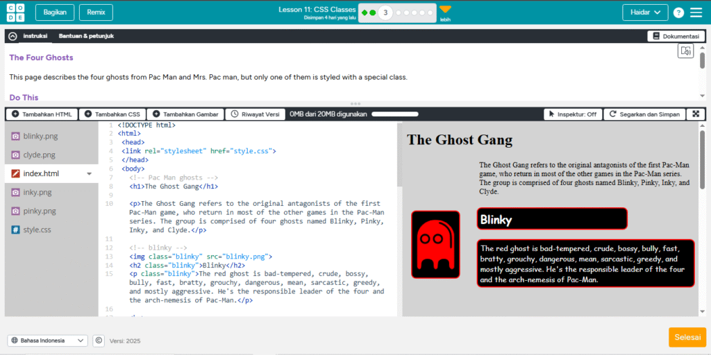 disini kita disuruh menghias keempat gambar hantu dari game Pac man dan menghiasi warna paragraf dan juga font atau bentuk huruf tetapi menghiasinya dengan berbeda dari hantu Pac man yang lainnya dengan cara memberi kode Class ke dalam kodingan HTML,jika kalian ingin mengetahui cara memasang kode Class nya ada di instruski jika kalian scroll ke bawah akan ada Tulisan Seperti ini
